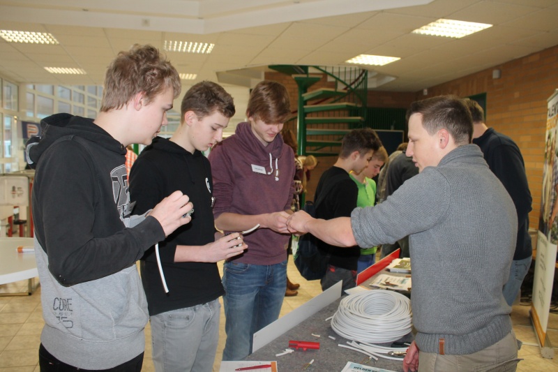 Auch in den Werkräumen herrscht großer Andrang. Dort riecht es nach Holz, man baut Grillzangen zusammen. Außerdem wird ein Stück Metall mit Körner, Hammer und Gewindeschneider bearbeitet. Zwischendurch zeigen sich die Jugendlichen stolz gegenseitig die Rückmeldungen von den Betrieben und tauschen ihre Erfahrungen aus. Folgende 16 Betriebe stellten am 26. Januar ihre Ausbildungsberufe vor: Malerbetrieb Bill, Samtgemeinde Neuenkirchen, Landwirt Grünebaum, Otte-Architektur, Hülsmann-Reisen, Tischlerei Wilke, Tischlerei Böwer, Kfz Rüther, Fleischerei Bergmann, Markant-Markt Schulte, Bauschlosserei Wilke, VR-Bank im Altkreis Bersenbrück, St. Elisabeth-Stift, Mertens Haustechnik, Georg Pinke GmbH und Gasthof Dückinghaus. Mindestens 10 Stationen wurden von den Schülerinnen und Schülern abgearbeitet.