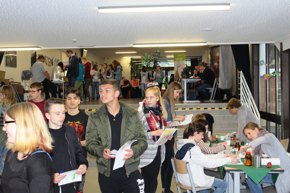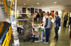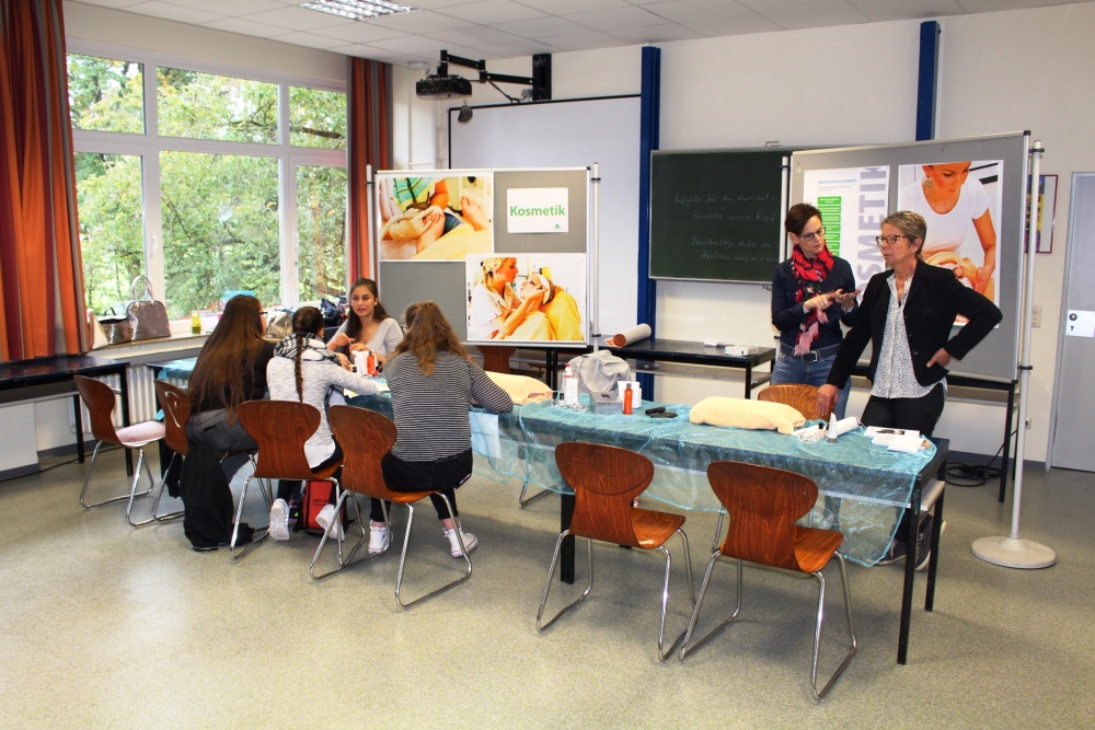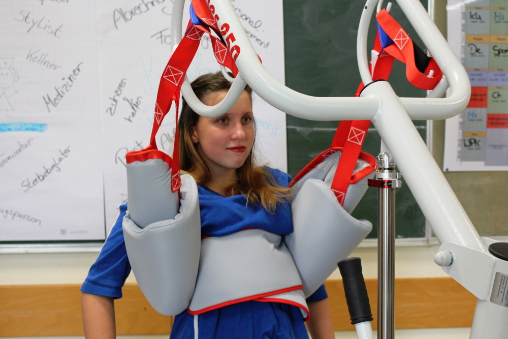Auch Tessina Pinke ist zufrieden: Eine Reihe von jungen Mädchen drängen sich am Stand der Pflegeeinrichtung Haus am Berg. Sie interessieren sich für die präsentierten Ausbildungen zur Altenpflegerin oder Sozialassistentin, aber auch für die Kauffrau im Gesundheitswesen. Gespannt warten sie an der Aufstehhilfe für beeinträchtigte Menschen darauf, selbst tätig zu werden: „Dass etwa der Beruf der Altenpflegerin auch eine technische Seite hat oder dass heute sehr viele Arbeitshilfen EDV-gestützt arbeiten, überrascht viele Jugendliche“, so Pinke, die die Ausbildungen im Haus am Berg organisiert.