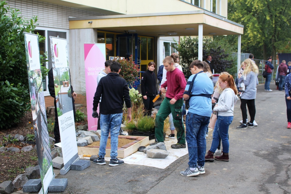 Hasbergen. In der Schule Am Roten Berg in Hasbergen herrscht geschäftiges Treiben: Über 400 Achtklässler aus der Hüggelgemeinde, aus Hagen und Georgsmarienhütte drängen sich an den Ständen von 30 regionalen Unternehmen. Es geht um Ausbildungsberufe und Praktika, es wird praxisnah gearbeitet, aber der Arbeitsalltag wird auch anschaulich von Auszubildenden erklärt. „Wir sind sehr zufrieden mit der Resonanz“, sagt Magdalena Antonczyk von der Servicestelle Schule-Wirtschaft der MaßArbeit: „Die meisten Jugendlichen setzen sich wirklich intensiv mit verschiedenen Ausbildungsmöglichkeiten auseinander und viele Firmen haben bereits Bewerber für Praktika gefunden.“ Veranstaltet wird „Talent trifft Ausbildung“ von der MaßArbeit in Zusammenarbeit mit der Gemeinde Hasbergen und der Schule Am Roten Berg. Das Unternehmen Otten – Gärtner von Eden ist zum ersten Mal dabei und Vanessa Otten ist zufrieden. Sie hat für den Berufsorientierungsparcours, auf dem die Jugendlichen sechs Arbeitsproben ablegen müssen, eine kreative Aufgabe mitgebracht: Die Schülerinnen und Schüler legen zunächst auf einem Sandquadrat eine Mähkante und bauen eine kleine Trockenmauer. Dann können sie mit verschiedenen Pflanzen und Materialien den entstandenen Minigarten selbst gestalten. Die Begeisterung ist groß und der Firmenchefin ist ihre Freude anzumerken: „Ich habe schon die ersten Kontaktdaten eines Schülers in der Tasche, der gern bei uns ein Praktikum machen möchte“, erzählt sie. Und die nächsten Aspiranten stehen schon bereit.