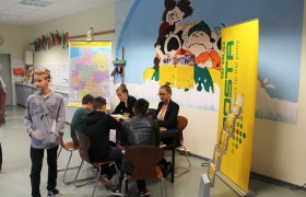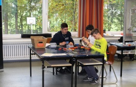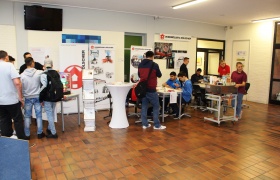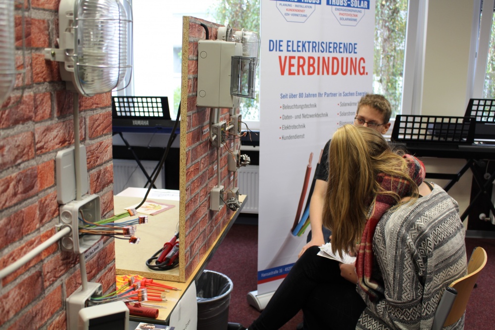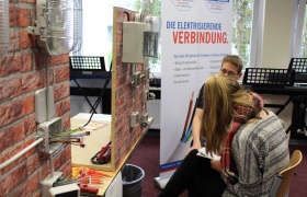 Stefanie Tröbs dagegen beobachtet an ihrem Stand auch einige Jugendliche, die ein bisschen im Schulausflugsmodus daher kommen: „Die nehmen das oft noch nicht so ernst, das Thema Berufsorientierung hat nicht immer Priorität“, so der Eindruck der Chefin des Unternehmens Elektro Tröbs aus Hasbergen. Diese Erfahrung hat auch ihr Auszubildender Maik Sierp gemacht. „Doch es gibt auch die motivierten Jugendlichen, die sich gut vorbereitet haben: Die fragen sehr zielgerichtet und nehmen sicher viel von der Veranstaltung mit.“ Das gilt zum Beispiel für Jocelyne Prinz, Schülerin der Schule Am Roten Berg. „Ich habe mir meine Arbeitsproben im Vorfeld natürlich nach Interesse zusammen gestellt, aber ich schaue mir auch Bereiche an, von denen ich bisher kaum etwas weiß“, skizziert die 14-jährige. Und lässt sich, angeleitet von Maik Sierp, auf die Welt der Schalt- und Stromkreise ein.