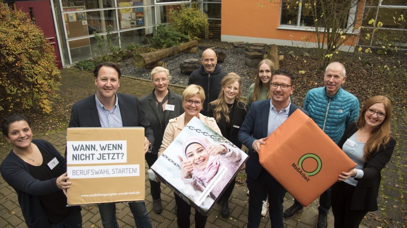 Bildunterschrift: Die Freude über die gute Resonanz auf das Speed- Dating war riesengroß (v. l. n. r.) : Tobias Avermann, Bürgermeister der Gemeinde Bad Laer, Stephanie Baalmann, Schulleiterin Geschwister-Scholl-Oberschule Bad Laer, sowie Lars Hellmers, MaßArbeit Vorstand.
